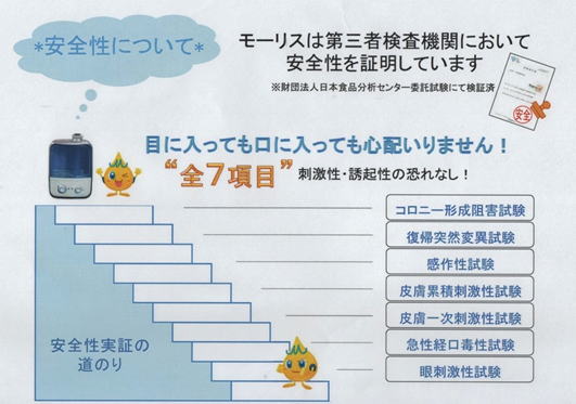 モーリスは中性に近い弱酸性の低濃度で使用するため皮膚の炎症事例はありません。 また人体に入っても有機物に反応し反応後は分解して水になります。環境にやさしい。
